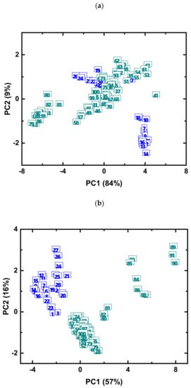 PC1-PC2 score plots for the multisensor array data (a) and the reference analytical methods (b). Samples 1–28 are from Mahananda River (blue numbers), and samples 29–100 are from Hooghly River (dark cyan numbers).