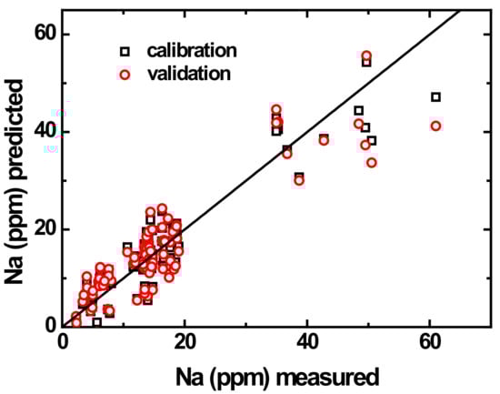 The data evaluation step yielded promising results in assessment of pencil-drawn multisensor system potential for water analysis, and it was followed by the regression modeling using the PLS technique in order to explore the possibility of the numerical prediction of certain chemical parameters in river waters based on the response of the zeolite sensor array. Figure 6 shows a typical “measured vs. predicted” plot obtained in 10-fold segmented cross-validation of the PLS model intended for numerical prediction of sodium content. A reasonably high correlation can be observed in the data points. Table 3 shows the figures of merit of multivariate regression models obtained in the prediction of several water quality parameters. The range of the variable change is different for different parameters; thus, the inspection of the RMSECV values should be done with accounting for these differences. As a more convenient measure of model performance, we have also calculated mean relative errors (MRE) that can be considered directly, without the range.