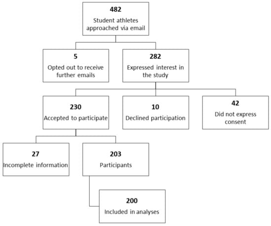 Out of 482 student-athletes invited to participate in the study, 5 opted out to receive further email invitations (1.0%), and 282 showed some interest in the study by initiating the survey (view rate: 58.5%). Of these, 42 did not express consent (14.9%), 10 did not agree to participate in the study (3.5%), and 230 agreed to participate in the study (response rate: 81.5%; 47.7% of the total study population). Of those who agreed to participate in the study, 27 did not provide complete information and were excluded from the analyses (completion rate: 203/230, 88.3%). Out of the remaining 203 participants, 200 provided valid information on the use of fitness trackers, our primary outcome, and were included in the analyses (42% of the total population). The participant flow is provided in Figure 1 below. The characteristics of the analyzed sample are summarized in Table 1 below, which includes a breakdown of the sample by ever use of wearable technology. We did not include sample weights as we did not have demographic information on the student population.