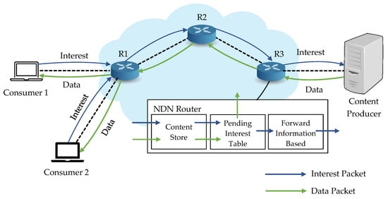 - Router: who forwards the interest and data packets to and from the content producer and the consumer; caches the returned data packet to satisfy the future requests from the consumer.