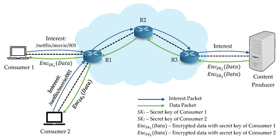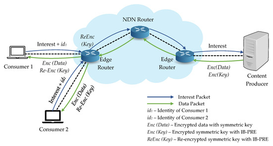 - Silva, R.S.D.; Zorzo, S.D. On the use of proxy re-encryption to control access to sensitive data on information centric networking. In Proceedings of the 2016 International Conference on Information Networking (ICOIN), Kota Kinabalu, Malaysia, 13–15 January 2016. [Google Scholar] [CrossRef]