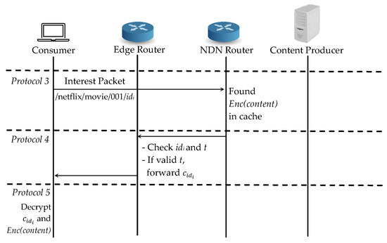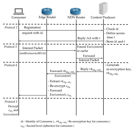 - Zhu, Y.; Huang, R.; Tao, Y.; Wang, X. An edge re-encryption-based access control mechanism in NDN. Trans. Emerging Telecommun. Technol. 2019, 30. [Google Scholar] [CrossRef]