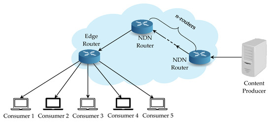- NDN Router: NDN router forwards the requests from consumers to the content producer. It will also cache the data packet before sending it back to the requested consumer and deliver it to other consumers according to the same request.