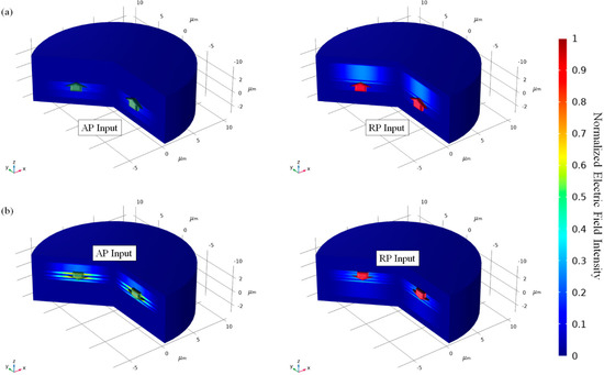 Electric field intensity pattern of protected MSCRA structure for each AP and RP inputs with direction of (a) Substrate to free-space and (b) Free-space to substrate, respectively.