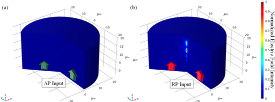 After designing the lens, a full vectorial numerical simulation has been performed to test the protected MSCRA assisted lens. The optimized value obtained on Section 3.1 has been used. Both AP and RP component Bessel beam has been illuminated, and the results are shown in Figure 4. Most of the AP component light has been prohibited to transmit the lens, but the RP component light has been focused on desired position, z = 10 μm and 15 μm.