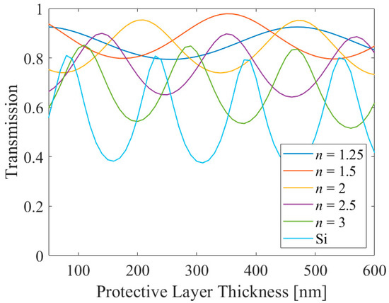 The component transmission of the protective layer applied MSCRA for various materials in terms of protective layer thickness.