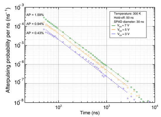 The probability of an afterpulsing event requires the knowledge of the afterpulsing probability temporal distribution of the detector, i.e., , for ranging from to , this last corresponding to the time interval after a photon detection, beyond which the afterpulsing probability is negligible. Such time distribution can be experimentally measured, by observing the time interval between two consecutive SPAD ignitions with no light illumination, after subtracting the dark counts. An example of probability distribution is shown in Figure 2, adapted from [20].