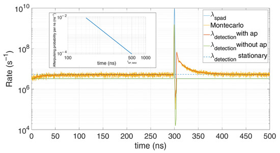 Comparison between Monte Carlo simulations and the model taking into consideration the afterpulsing probability (shown in the inset). Note their perfect match; the distortion compared to the actual expected distribution (blue) is due to the SPAD afterpulsing.