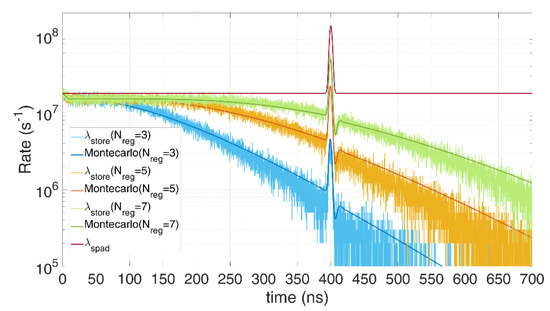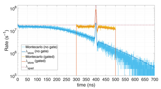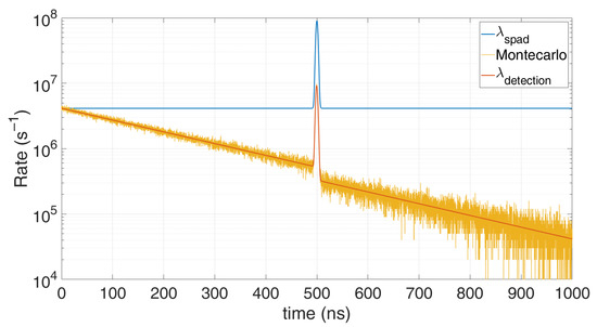 Figure 5 shows how this model perfectly matches the Monte Carlo simulation: an average of 0.5 signal photons and four noise photons are considered within the 1 µs observation time. The typical exponential decay due to pile-up distortion is clearly visible.