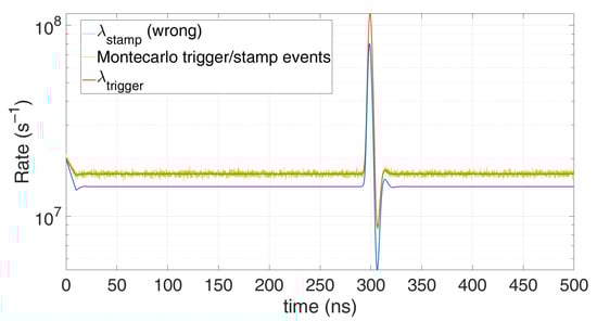 and , as in Equation (1). In this case, the first model described by Equation (1) fits perfectly, since only one time stamp can occur after one detection. However due to the approximation, the model in Equation (3) gives the error shown in Figure 7. Conversely, in case the SPAD hold-off time is negligible compared to the TDC dead-time, the dependency of TRIGGER event with the previous instants is very weak, so the approximation holds better, as shown in Figure 8.