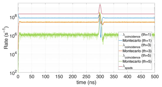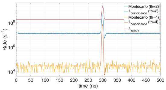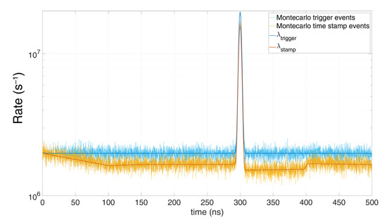 The result converges to others reported in literature [18,19] and is shown also in Figure 1, which compares this model with a Monte Carlo simulation, in case of 80 background photons within the simulation time (500 ns) and 20 signal photons within a 5 ns FWHM gaussian shape pulse, centred at a 300 ns. All simulations were performed with Tstep = 100 ps quantization step and 100,000 repetitions. It can be noticed the heavy pile-up distortion due to the 10 ns hold-off time: the expected peak at 300 ns is shifted toward longer arrival times and gets compressed. Furthermore, in stationary conditions (constant λspad) the actual detection rate is lowered by a factor . As can be seen, the model perfectly matches simulations since no approximation have been introduced.