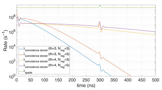 Figure 9 shows the pile-up distortion due to the limited number of registers, the first measurements (at shorter time) have higher probability to be stored since storage registers are still empty. The assumptions made to simplify the model can still provide a good approximation. In the following, in order to avoid such a heavy distortion, we investigate three different solutions, namely, photon coincidence, time gating, and multi-TDCs.