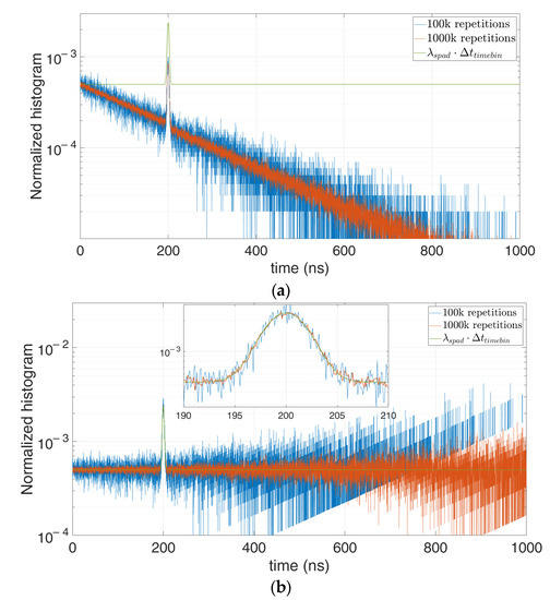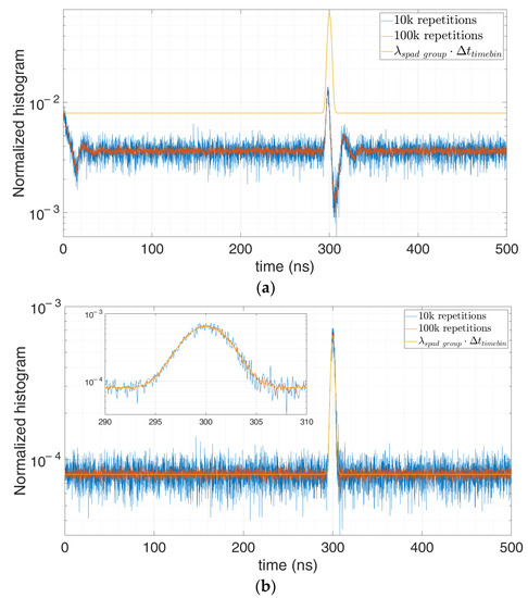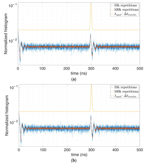 We performed different simulations with different number of repetitions and average number of signal and background photons. For example, let us consider 0.1 signal photon and 1 background photon on average per laser shot repetition, so as to get . Figure 15 shows that the higher the number of repetitions becomes, the less noisy the measured histogram gets and the better the correction results.