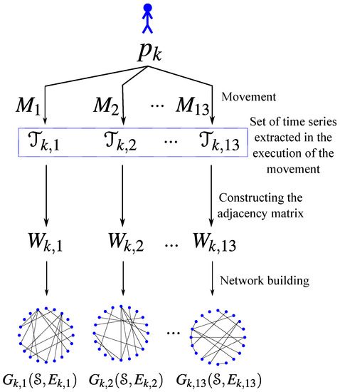 Algorithm 1 summarizes the steps for creating a graph associated with the individual and movement . The algorithm takes as input the time series representing the respective joint angles and it outputs the networks , that is, the adjacency matrices . In terms of computational times, the algorithm takes around a tenth of a second to calculate one network and, consequently, as we need to calculate networks, the method takes around s to compute all the networks in a personal computer with 2.4 GHz Intel(R) Core i7 CPU and 16 GB of RAM.