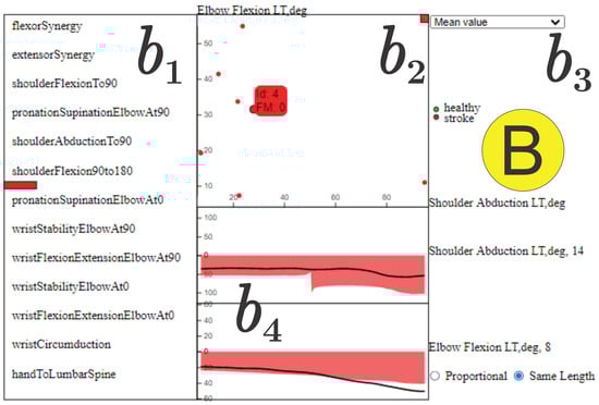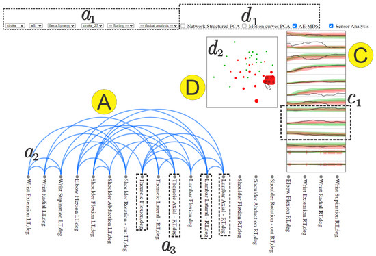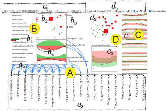 The Fugl–Meyer Assessment (FMA) [3] is a clinical bedside instrument to assess abnormal motion in stroke patients. It is considered the gold standard for measuring motor impairment, and is used to guide rehabilitation treatment. The FMA testing protocol evaluates patients as they perform particular movements on both upper extremities (UE), which is the focus of this work, and lower extremities (LE). A trained assessor scores the movements according to a grading scale. The FMA is challenged by the need for a trained assessor and by the subjectivity and coarseness of its grading scale, which both limit the frequent administration of the FMA and the nuanced capture of impairment. In the last decade, FMA scoring has been complemented using data from sensors affixed to the patient’s UE [4,5,6], making it less subjective. These motion sensors generate a large amount of data that can be used to perform tasks other than FMA score computation. For example, the sensor data could be used to generate finer details about movement abnormality and identification of compensatory movements (alternative movement strategies to circumvent impairment). In these cases, the sensor motion data are collected and analyzed from Wearable Sensors Networks (WSNs) [7], which are defined by a set of interconnected sensors dedicated to collecting physiological parameters in the patient’s body. This technology can be used, for example, to diagnose patients through telemedicine applications [6] to analytically detect the compensatory actions of patients in rehabilitation [8], and others [9]. However, computational tools devoted to the visual analysis of a large amount of motion sensor data is quite scarce, especially in the context of assessing the motor function of stroke patients.