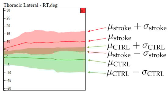 Detailed Relation View showing a detailed view of the time series associated to joint angles, “Shoulder Abduction” and “Elbow Flexion”. The black curve in shows the data from one stroke individual (“stroke_4”) performing the “Shoulder Flexion to ”. In the component, there are seven stroke individuals ( and ) for which these joint angles are significantly synchronized, and the average motion curve of these individuals is shown in for each of these joint angles as a red area mirrored on the y axis. This shows that “Shoulder Abduction” and “Elbow Flexion” are synchronized, suggesting the intrusion of flexor synergy. Note the absence of healthy control information (green circles and green curve) for this edge, indicating that synchronous activity in these joint angles does not normally occur in healthy movement.