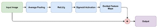 SE blocks consolidate the input feature maps and squeeze the feature channels using global average pooling to reduce the input to a single value across all channels. Then the model achieves the desired non-linearity by going through ReLU activation, divided by a complexity value g = 8. The complexity value reduces the parameters in the output channel. A complexity value of 8 is typically used in networks that implement SE blocks [15]. The side path of the input is then multiplied by the excited maps, leading to feature maps with adaptive weights [15,16].