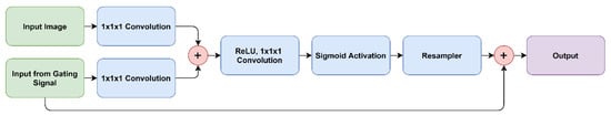 Both inputs from the encoder and the gating signal are fed through a 1 × 1 convolution, to ensure consistency in the number of channels while maintaining their original size. The results from both paths are summed and passed through a ReLU function, another 1 × 1 convolution, and finally through a sigmoid activation. The result is a distribution from 0 to 1 of the importance of the corresponding feature channel, in which higher values correspond to higher importance. The product is an attention map that is then multiplied by the skip connection from the gating signal to produce the attention block, where further deconvolution takes place. This concept is similar to SE blocks where a map is created, which is then applied to the input to improve adaptivity [18,19].