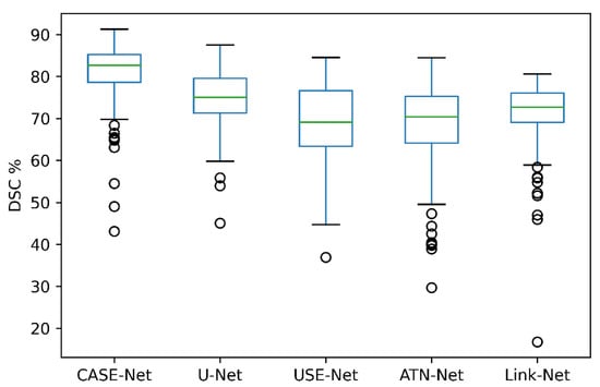 Figure 5 visually depicts the segmentation performance of our proposed CASE-Net and the other competitive architectures. As shown, CASE-Net had the highest DSC when compared to U-Net, USE-Net, ATN-Net, and Link-Net. Relative to the other networks, CASE-Net demonstrated the highest and values. All networks were calibrated using their optimal loss, optimizers, and learning rates from their respective papers. In addition, each network used the same 5-fold validation, batch size, number of epochs, image augmentations, and dataset.