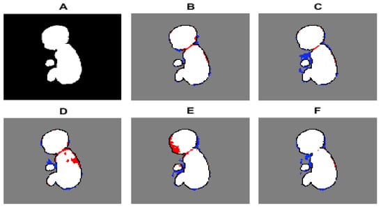 Pixel-to-pixel comparison of the ground truth mask against the predicted segmentations of various architectures. (A): Label, (B): CASE-Net, (C): U-Net, (D): USE-Net, (E): ATN-Net, (F): Link-Net. TP is given by the color white, TN is given by the color grey, FP is given by the color blue, and FN is given by the color red.
