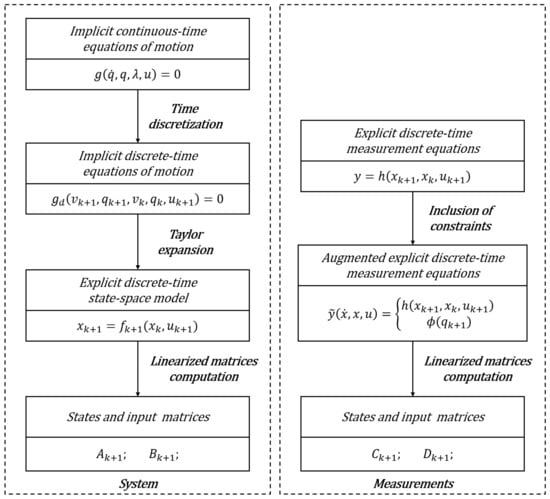 The augmented discrete extended Kalman filter (ADE-KF) tailored for MB models is discussed in this section. In this section we discuss all the required components to set up a Kalman filter for assimilating the different multibody states and unknown inputs. More in details, in Section 4.1, the general form of the discrete-time system and measurement model equations are summarized. In Section 4.2, the measurement equations are augmented with the constraint equations , to deal with the constrained nature of the MB EOMs, leading to a constrained estimation problem. Moreover, in Section 4.3 the adopted approach to compute the linearized measurement matrices C and D are presented since they are required in the estimation framework and not directly available. Finally, in Section 4.4 the ADE-KF is assembled to deal with the estimation of states and unknown inputs, and the Kalman filter steps tailored for MB models are reported.