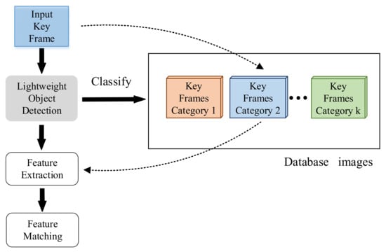 This is an overview of the proposed LFM framework; dashed lines indicate the category of the input key frame image. The database image consists of the key frames image entered previously.
