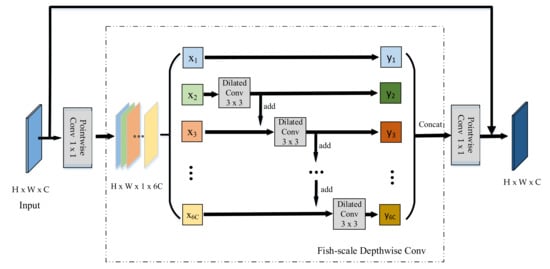 Inspired by MobileNet [20,28], a novel convolution block was proposed based on the inverted residual block, which depth-wise convolution is related to each other and transmitted in turn. Its structure is like a fish scale (it can be seen in Figure 2); therefore, we call it a fish-scale convolution block.