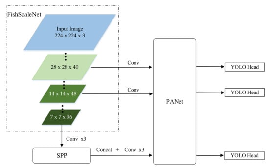 Pipeline of the lightweight YOLOv4. The size of the input image is 224 × 224 × 3, and three effective feature layers with different initial sizes are obtained through FishScaleNet, which are, respectively, introduced into the enhanced feature extraction network: SPP and PANet. The three preliminary effective features were fused to obtain a more effective feature layer, and input to the predictive convolution head, YOLO Head, to obtain the detection results.