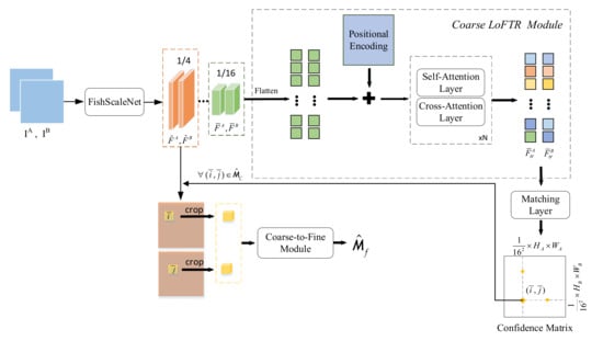 For two similar images IA and IB in the same category, we used FishScaleNet to extract the multi-level features of the two images. LoFTR uses features extracted at 1/8 and 1/2. For lightweight FishScaleNet, and are used to represent coarse features extracted at 1/16 of the original image size, and are used to represent fine features extracted at 1/4 of the original image size.