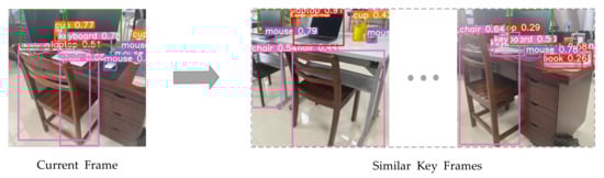 For target detection on COCO dataset—Faster RCNN in two-stage and YOLOv4 in one-stage were our target detection frameworks. Experiments show that our FishScaleNet can achieve higher mAP value and faster speed on the YOLOv4 framework. At the same time, our lightweight target detection network has a certain feasibility in the LCD task. The current frame image was transmitted to the network for the object detection task, and object labels (as shown in Figure 8); cups (0.77), chairs (0.66), laptops (0.51), and books (0.34) were obtained. Labels with predictive probability less than 0.5 (such as books) were eliminated, and then binary classification was carried out on the images. Finally, the binary vector results of classification were passed into the key frame database of the same category for the feature matching task.