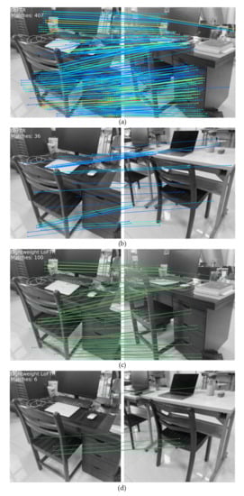A mass of experimental data in [45] demonstrates the accuracy and superiority of LOFTR for feature matching in low-texture regions as well as symmetric and repeated regions, and the performance of relative pose estimation and visual positioning on multiple data sets reaches the most advanced level. Here, we only compare the feature matching results of the lightweight LOFTR with the standard LoFTR. As shown in Figure 9a, standard LoFTR will notice a large amount of deep feature data, and abundant calculations are not suitable for our real-time LCD task. For non-loop-closure frames, there will also be nearly 9% false matches, as shown in Figure 9b. For our lightweight LOFTR, as shown in Figure 9c, feature matching can be performed quickly for only 1/4 calculations of the former, providing real-time data support for our LCD. In addition, for non-loop-closure frames, as shown in Figure 9d, our mismatching rate is about 6%, which improves the accuracy and recall rate of LCD tasks. In summary, the lightweight LOFTR can quickly identify the relationship between the current frame and similar key frames, which greatly helps the robot to determine whether the current position is loop or not.