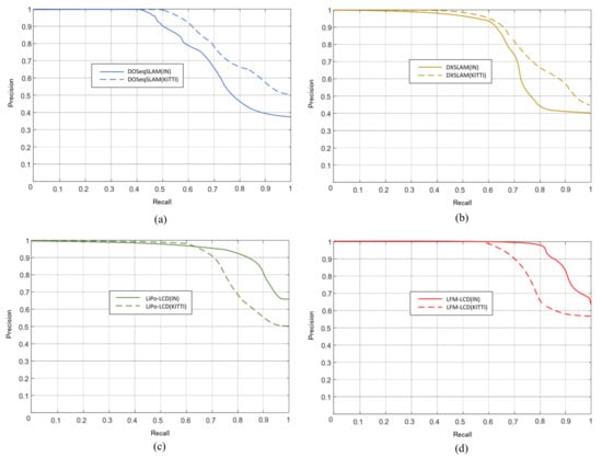 Precision = TP/(TP + FP), Recall = TP/(TP + FN). In this equation, true positive (TP) means loop closure for both GT and detected results. False negative (FN) means that GT is loop closure, but detection is not. A false positive (FP) indicates that the detected result is loop closure, but in fact it is not. We used Precision–Recall Metrics to evaluate our system. Precision is defined as the ratio between true-positive identifications and the total detections of algorithm. Recall is defined by the number of detected loop closure events over the actual events appearing in the ground true. The RP-Curve can be seen in Figure 10.