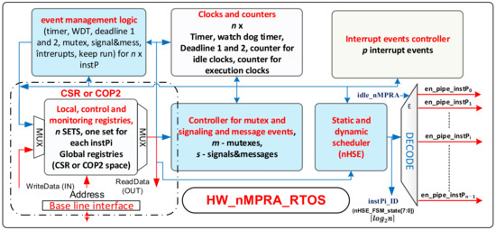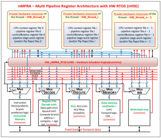 Programmable logic technology based on a FPGA is a fundamental component of a lot of hardware design and can be extremely useful in microprocessor architecture research. Affordable FPGA circuits with a high number of logical gates [3] are used as hardware support for the implementation and testing of proposed concepts [4]. The real-time aspects of some RTSs are critical in fields such as aviation, automotive, robotics, and movement command and control. For these systems, predictability is a very important feature. The ability to develop RTOS hardware accelerators, hardware schedulers, or HW-RTOS alongside RTOSs will allow rapid response times (low latencies) to external stimuli and events, i.e., asynchronous events, and controllable deterministic behavior in both simulations and practical demonstration deployment using FPGA technology [5]. The objectives of the innovative solutions described in this paper are to design and validate a high-performance nMPRA (multi pipeline register architecture, where n is the degree of multiplication) and nHSE (hardware scheduler engine for n threads) microarchitectures by implementing RTOS-specific functions in hardware, minimizing the kernel latency. In this context, the nMPRA concept and nHSE module provide an innovative solution with a kernel latency to events of one or two processor cycles, which is a significant improvement over the software solutions of RTOSs or software/hardware hybrid implementations. nMPRA is a custom architecture with multiple (n) pipeline registers. The purpose of this project was to design, implement, test, and validate an innovative concept named HW_nMPRA_RTOS (a unified acronym for nMPRA, nHSE, and RTOS API), which uses and extends concepts regarding the multiplication of CPU data path resources, the nHSE as scheduling module, and the hardware implementation of an RTOS.