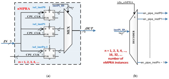The architecture can comprise 2–8 pipeline stages and 2–32 threads or even more if necessary (we do not recommend this). Figure 2a presents a resource multiplication solution with multiplied memory elements. All entries are common, and the memory bits have the same clock signal, but at some point, only one set is active because the flip-flop validation entries are connected to the output of a decoder (only one output is active at a time if the decoder is validated, i.e., the E entry is active, which means that there is at least one nMPRA instance running), as shown in Figure 2b.