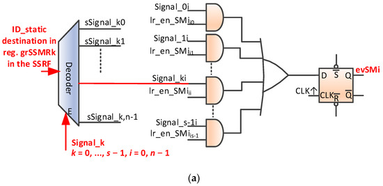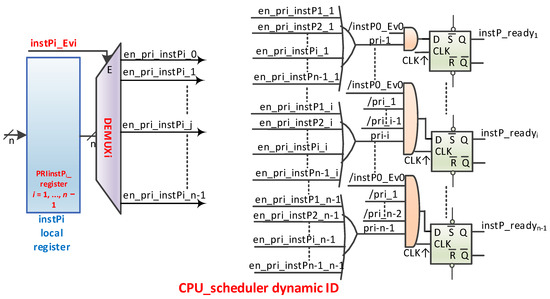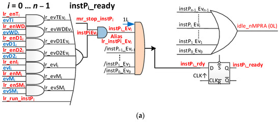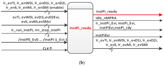 The operation of the system shown in Figure 4a (where the “/” sign indicates a bitwise complement value) is as follows. If one or more of the seven mentioned events occurs and at least one is validated, then the instilEvi signal is activated. If the mr_stop_instPi signal is activated (only nMPRA instP0 can enable/disable it), then the instPi_Evi signal is activated. If no higher priority nMPRA instance is active (/instP0_Ev0, …, /instPi − 1_Evi − 1), the signal instPi_rdy that is connected to the data entry of the D flip-flop is activated and will be stored by the first positive edge of the nMPRA clock, activating the instPi_ready signal, which, in turn, is part of the logic that generates the instPi_ID that is ready for execution and has the highest static priority (lowest number).