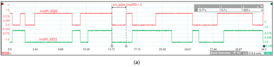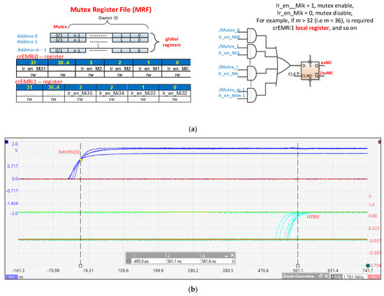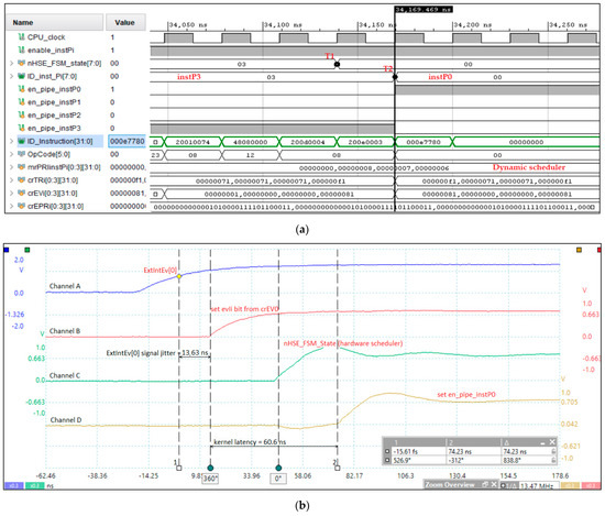 Figure 12b illustrates the practical measurements of the interrupt event latency based on the scheduler implemented in HW_nMPRA_RTOS. In this test, the interrupt event was validated by means of the lr_enIi bit in the crTRi register (with the highest priority). The time period shown in the oscilloscope capture (Δt = 381.6 ns) includes external signal triggering, instPi_ready flip-flop (Figure 4a), setting the en_pipe_instP0 signal for instP0 (Figure 6), jumping to the appropriate handler (Table 8), executing the sw MIPS32 instruction, and changing the digital output state mapped in the address space of the data memory.