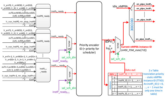 This paper proposes an improved variant of the scheme that is presented in Figure 4a by including an additional signal that detects the state in which no nMPRA instance is ready for execution, namely, the signal idle_nMPRA (0L = IDLE). As a result of the introduction of this signal, the identifier of instPi has n + 1 bits as the highest bit to indicate whether (i.e., 0) or not (i.e., 1) an instPi is active. The block diagram of the module that manages the ready-to-run status of an nMPRA instance (logical event management block in Figure 3) is shown in Figure 4b.