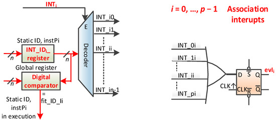 The proposed scheme is very versatile and can implement multiple models of work with interrupts in a real-time execution. In terms of prioritization, a schema deficiency occurs when multiple interrupt events are attached to instPi; a loop test is performed in which prioritization is implemented through software and the response time depends on the loop position. Based on the ideas expressed in [22] and [23], a possible improvement is presented in Figure 12a. The priorities of interrupts, if they are all attached to a single instPi, is INT0 for the highest priority and INTp − 1 for the lowest priority. From this point of view, the priorities are fixed. To take into account only the interrupts of instPi (the highest priority) at a time, local crEPIji registers are provided (j is instPj, and i is the number of the register attached to interrupt i). This register contains one bit for each of the p interrupts. If the bit is 1L, then the interrupt is attached to the thread, and the INT_IDi register must be written with the identifier of that thread. This correspondence must be provided for any interrupt attached to instPi. If this connection is not performed for an interrupt, then it will never generate an event because the evINT_ji signal will be 0L. The evINT_ji signal is activated if the instPj to which the event was attached is running, with the fit_ID_i active signal being 1L. The evINTi signal, for example, handles all possible attachments of the interrupt to instPi, but it is mandatory that an interrupt be attached to a single thread. Therefore, because only one instPj is active at any given time, only interrupts of that instance can be active when entering the priority encoder. Thus, using the grNrINT register, the j instance will read the interrupt number with the highest priority. A bit will signal a possible error in the sense that there is no active interrupt. Attaching an interrupt event to a specific instPi (equivalent to attaching the event to thread i) is similar to setting a priority level for an NVIC-handled interrupt in ARM processors. The difference is that, in this case, the priority of a thread acting as an interrupt event handler can increase.