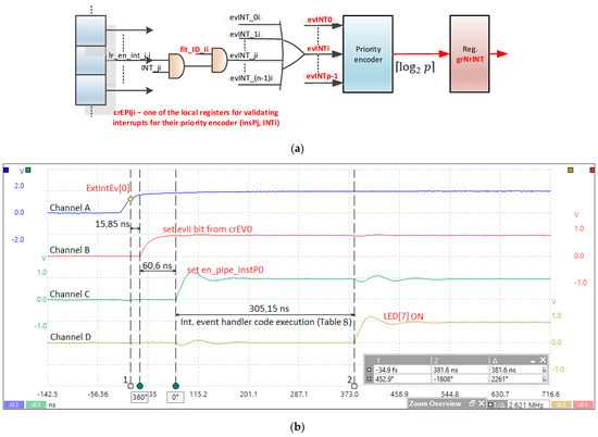 Hardware management of interrupt events. (a) The logical schema of generating the number associated with the interrupt event that is also its priority; (b) Interrupt event latency (Δt = 381.6 ns): asynchronous external signal triggering = 15.85 ns (Channel A), kernel latency = 60.6 ns (Channel B–Channel C), and real-time response = 305.15 ns—en_pipe_instP0 = 1, CPU executes the first C instruction of the handler routine and set LED[7] (Channel D).