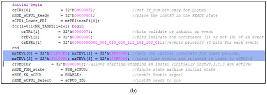 This module generates time events at the level of each instPi: deadline 1 (D1i), deadline 2 (D2i), and watchdog timer (WDTi) tick event types. Two counters are provided to measure the operating cycles (CNTExi) and the stationary ones (CNTIdlei) at the level of each instPi and at the level of the CPU (CNTEx and CNTIdle). Figure 13a presents tick events with the signals instPi_ID[1:0] modified based on the signals lr_enTi and evTi in Figure 4a and the current instPi_ID in Figure 6. Figure 13b shows part of the initialization section of the nHSE registers, i.e., setting periods for tick events (mrTEVi[3:0]).