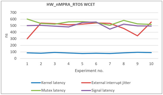 Table 12 presents the WCET coefficients in microseconds following the processor performance evaluation presented in this paper. Figure 14 illustrates the distribution of the obtained WCETs based on multiple measurements, the data being relative to the events associated with the highest priority instPi. The following times have been measured: the relative time for the initialization and boot operation of the HW_nMPRA_RTOS, the time required for the task context switching operation in the least favorable case when the assembly line contains atomic instructions, and the task activation time by an interrupt event.