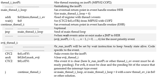 When the wait instruction is called (when lr_run_instPi = 1L), it compares events validated with thread_i_ev with events already pending. If one or more events in thread_i_ev are already pending, then wait loads the PC with the start address of the event handler routine (EHR) of the highest priority event (if there are more). If no events are waiting, then the wait Rj instruction deletes lr_run_instPi = 0L, the thread exits the ready-to-run state, and through the scheduler, HW_nMPRA_RTOS dispatches another instPi (the highest priority that is ready to run) to run the associated thread. When an event occurs for thread i (it becomes ready to run) and when instPi has the highest priority, the execution of the wait Rj instruction that sets the lr_run_instPi bit resumes and transfers control to the EHR corresponding to the highest priority event. In the EHR, the bit from the crEVi register must be deleted (with lr_run_instPi = 1L), and the time depends on the frequency of the occurrence and the behavior of the event. It is usually cleared at the end of the EHR. If the event is an interrupt, then the source that generated it must also be cleared. With the CTC2, CFC2, MFC2 (move word from coprocessor 2), and MTC2 (move word to coprocessor 2) instructions, all HW_nMPRA_RTOS functionalities are easily managed.