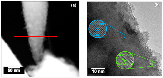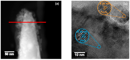 STEM images of the Fe2O3@ZnO structures (Figure 5a) showed a rod-like morphology covered by tiny particles. HRTEM images of these particles (Figure 5b) revealed crystalline structures with lattice spacings of 0.26 nm and 0.28 nm, assigned to the (002) plane of the hexagonal ZnO and the (222) plane of the cubic phase of the Fe2O3 identified by XRD, respectively. EDS line-scan profiles (Figure 5c,d) recorded along the red line in Figure 5a confirm the presence of Zn and Fe in the rod area and only Fe in the outer area of the rod.