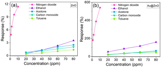 Figure 11 displays the results obtained by testing the sensors to various concentrations of each gas (1 to 10 ppm for nitrogen dioxide and 20 to 80 ppm for ethanol, acetone, carbon monoxide, and toluene). Overall, the four structures demonstrate their highest responses to nitrogen dioxide, despite the lower concentrations of nitrogen dioxide compared to the other gases. The results also show a proportional increase in the response with the gas concentration. The tests corroborated the best response for the Au@ZnO structures among the other structures for all tested gases and applied concentrations. For instance, the Au@ZnO response to 10 ppm of nitrogen dioxide is about 47 times higher than that of ZnO (see Figure 11a,b). The difference in the response of these two structures to 80 ppm of ethanol is similar, showing around 45 times higher response for Au@ZnO compared to ZnO. For the low concentration, the difference in the responses of Au@ZnO and ZnO is still significant. For example, the responses of Au@ZnO sensors to 1 ppm of nitrogen dioxide and 20 ppm of ethanol are approximately 37 and 25 times higher, respectively, in comparison to the response of ZnO.