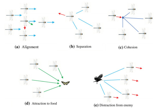 Dragonflies are elegant insects, having almost 3000 different species around the world. In the life cycle of a dragonfly, adults lay eggs in water and from eggs they become nymphs, spend most of the time of their life in this stage and then by metamorphism they become adults. Dragonflies have individual and rare swarming techniques. They have two main swarming techniques; static (feeding) and dynamic (migratory) swarm. Dragons make small clusters for food hunting in static swarm while in dynamic swarm large groups of dragons migrate over long distance [47]. This algorithm used in many optimization problems in WSNs. In [48] a protocol designed for VANET environment use DFA algorithm for optimized selection of cluster heads efficiently. Similarly in [49] also DFA algorithm used for optimization. The basic motivation of DFA starts with static and dynamic swarming behavior of dragonflies. These swarming behaviors are similar to optimization stages: exploration and exploitation [48,50]. Exploration and exploitation based on five principles as shown in Figure 2.