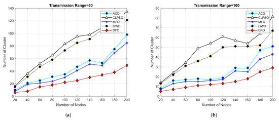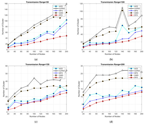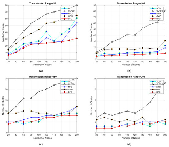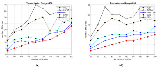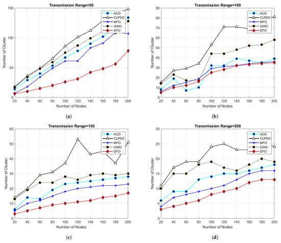 In Figure 4, the transmission range of nodes is set from 50 m to 200 m with a fixed grid scale (500 m × 500 m) and nodes density is set from 20 to 200 nodes. Results demonstrate that even with varying transmission range DFO give good results than all other algorithms in comparison and show continuity of batter results in all scenarios, alhough MFO shows closest results to DFO in same scenarios. In Figure 4a, when the transmission range of each node was set upto 50 m in a fixed grid size of 500 m × 500 m and total number of nodes was taken from 20 to 200, then number of clusters formed by DFO was 30, and number of clusters formed by MFO, ACO, GWO and CLPSO respectively was 55, 60, 62 and 140. In Figure 4b, when transmission range was increased from 50 m to 100 m then number of clusters formed by DFO was 10 and number of clusters made by MFO, ACO, GWO and CLPSO was 19, 23, 31 and 81. Similar kinds of results are shown by Figure 4c,d transmission range was increased to 150 m and 200 m. It is evident from the results that, at the point when we increment the transmission range of nodes, the entire clusters created by all algorithms decreased and DFO create optimized number of clusters in given scenario as compared to other algorithms. Results show that the effects of a transmission range on the amount of clusters formed, with increased transmission range less number of clusters formed resulting in optimized routing. It is obvious from simulation results that increasing the node’s transmission range ultimately reduces the number of clusters formed, and DFO outperforms in all instances.