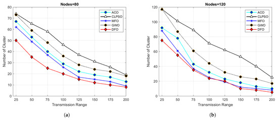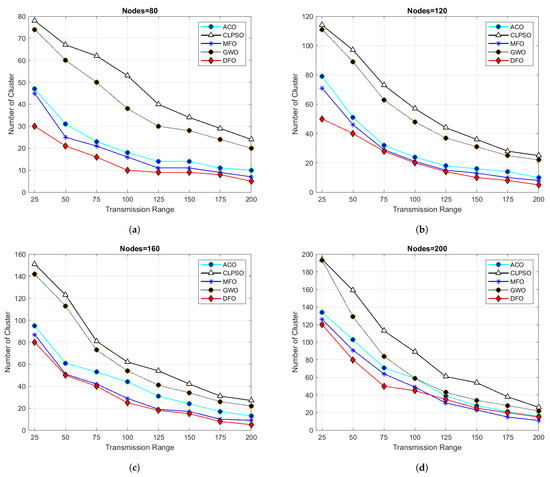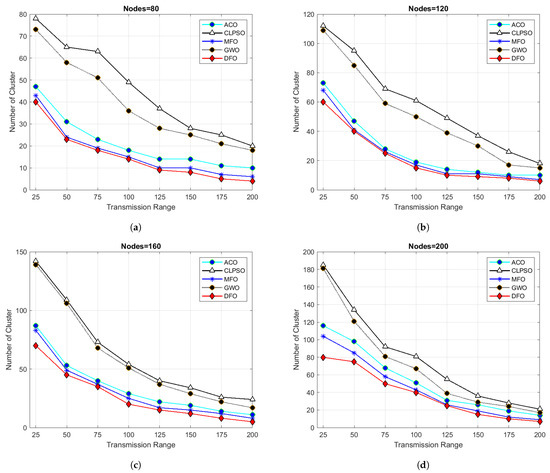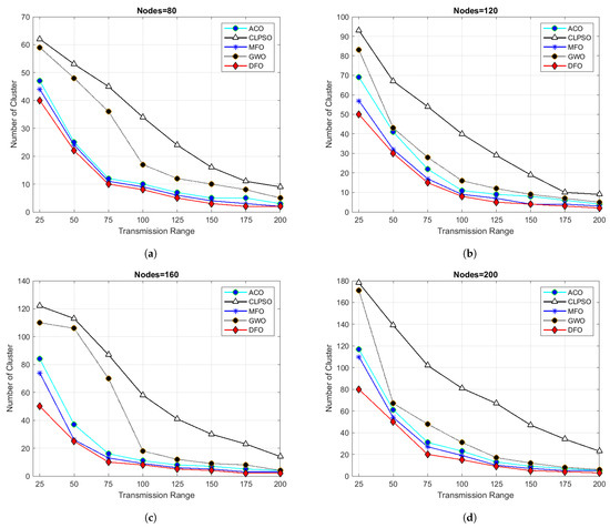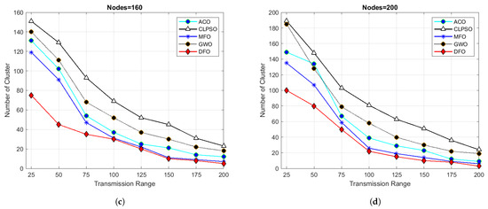 In Figure 8a, a node density of 80 nodes was taken with transmission range of 25 m in fixed grid size of 500 m × 500 m. DFO created 40 clusters, while MFO generated 44 clusters, ACO 47, GWO 59 and CLPSO 61. When transmission range of each node was increased to 200 m then DFO generated only 2 clusters, MFO 3, ACO 5, GWO 6 and CLPSO 9 clusters. This is reliable with well-established reading and if the nodes transmission range is bigger, minimum clusters will be made. Results shown in figure show that DFO outperforms other algorithms even if transmission range varies from 25 to 200. It is obvious by seeing the results in Figure 8a–d having number of nodes 80, 120, 160 and 200 m, respectively, DFO outperforms other algorithms and creates a lower number of clusters in a given space, which helps in optimizing routing in UWSNs.
