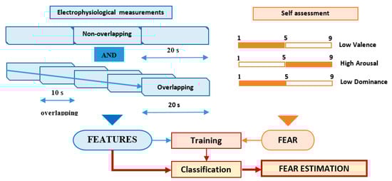 - Overlapping approach—each trial was segmented in five windows of 20 s length and 10 s overlap. Thus, five sets of 40 feature values were obtained for each trial, all of them being associated with the fear evaluated for that trial acting as five different data points, as can be seen in Figure 5.