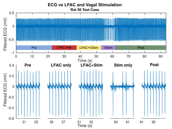The effect on heart rate during a test sequence consisting of (1) Pre (no stim), (2) LFACb only, (3) LFACb and Vagal Stimulation delivered together, (4) Vagal Stimulation only, and (5) Post (Recovery, no stim or LFACb). The top panel shows a continuous recording of the bandpass filtered ECG during the five epochs. The bottom panels show 2 s samples of the ECG for each epoch. © 2019 IEEE. Reprinted, with permission, from [1].
