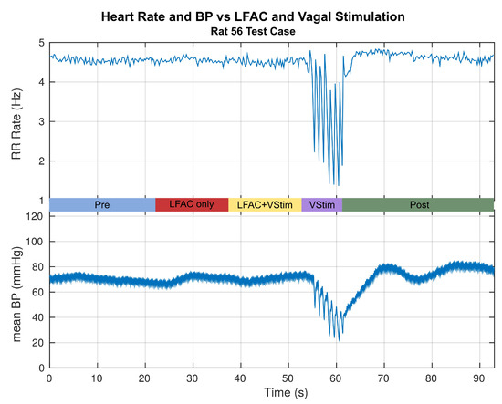 Effects of the typical test sequence on the RR rate of the QRS complex and mean arterial BP. The RR rate for this example is for the data presented in Figure 2. The HR and the BP show no change during LFACb and LFACb+Vagal Stimulation. This suggests that LFACb by itself does not activate fibers, and blocks the descending volley that elicits bradycardia and its accompaniment, hypotension. © 2019 IEEE. Reprinted, with permission, from [1].